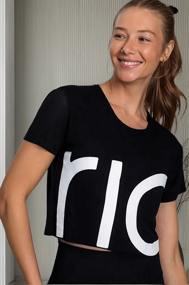 BLUSA RIO CROPPED MANGA CURTA ESTAMPADA RIOMODAL PRETO RIO YOGA