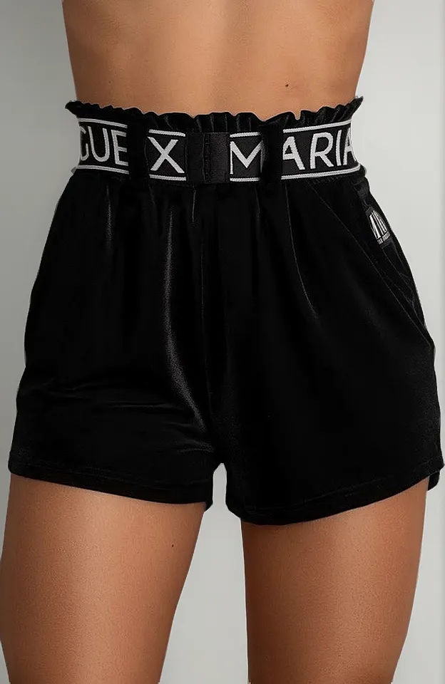 Short cintura alta em veludo, cós com leve franzido e cinto de elástico personalizado removível. Etiqueta personalizada aplicada na parte da frente. Possui short embutido como forro.